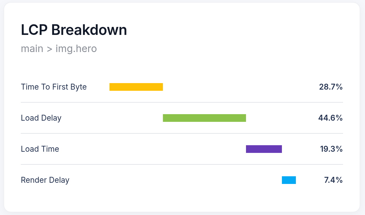 Load Delay ist der offensichtliche Engpass. Die Hälfte der gesamten LCP-Zeit verbringt der Browser damit, darauf zu warten, zu entdecken, dass das Bild existiert. Lighthouse, CrUX oder manuelle Untersuchungen hätten echte Schwierigkeiten gehabt, genau diese Kombination von Besuchermerkmalen zu finden, die dieses Problem verursacht hat.