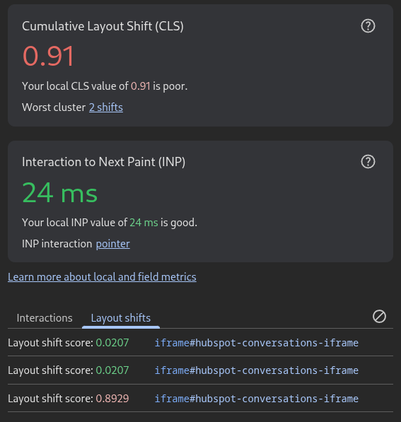 The HubSpot chat widget can cause a massive 0.91 CLS on a page. This is a well-known issue. So I fixed it for you. You can use my drop-in script below that takes CLS p75 from 0.91 to 0.00. In a perfect world HubSpot would fix it themselves. But they won't, and I can't change HubSpot's code. So it is a hack, I know, but it works.